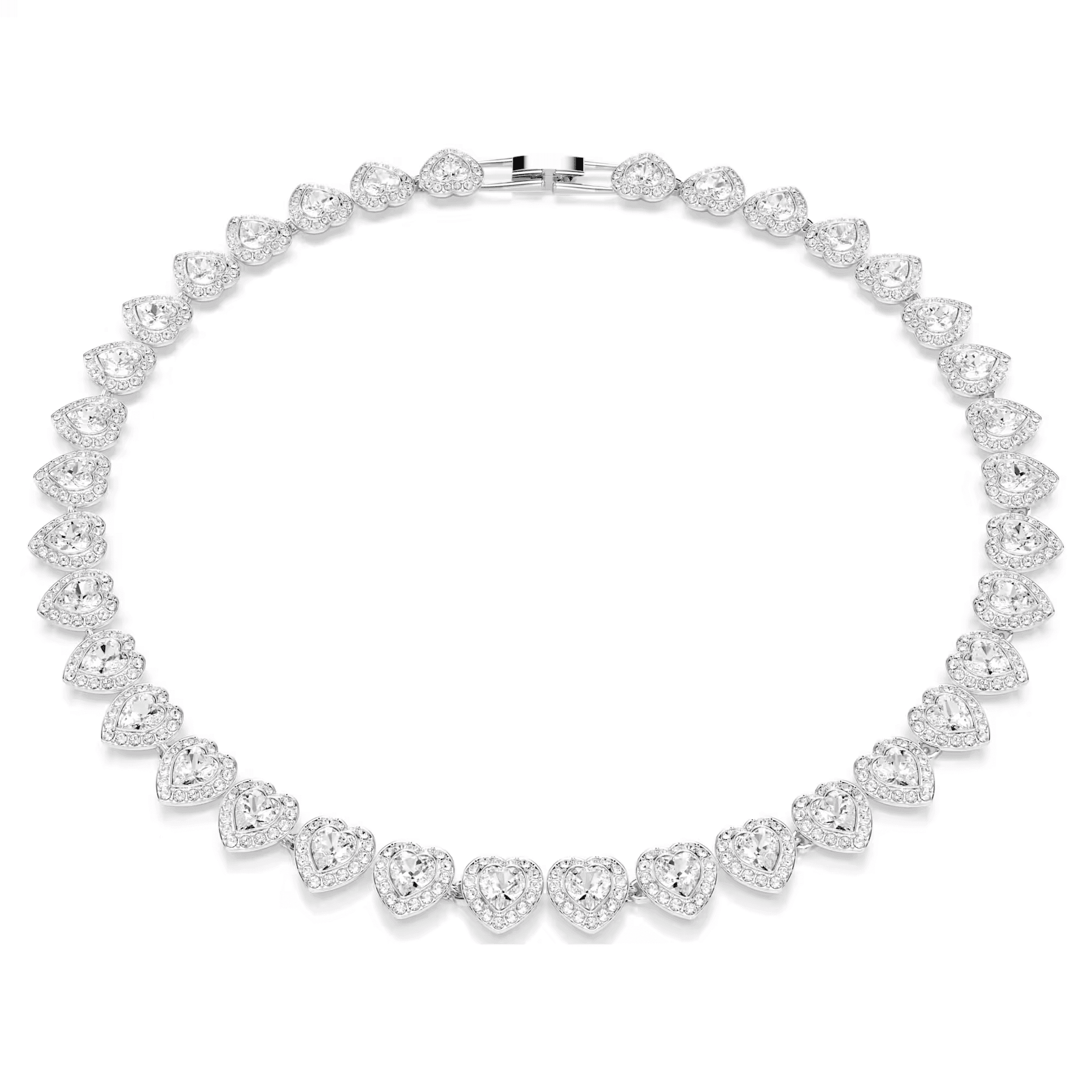 Iluminando el amor, este collar de Swarovski es tan romántico como radiante. El diseño chapado en rodio presenta un círculo completo de cristales con forma de corazón, cada uno rodeado por un brillante halo de pedrería transparente. Combina este collar con otras joyas a juego para crear tus propias y expresivas composiciones.