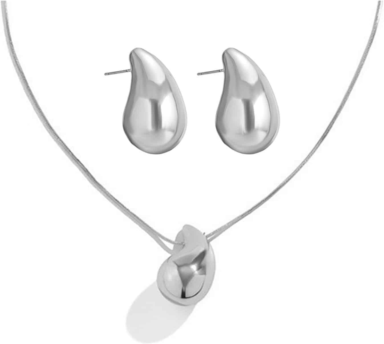 El conjunto de joyas con forma de gota de agua presenta líneas curvas suaves que evocan elegancia natural. El acabado brillante refleja la luz creando un efecto luminoso. Las piezas cuidadosamente elaboradas resaltan la belleza femenina con silueta estilizada con curvas.