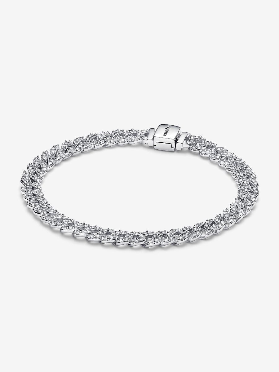 Eleva tu look con esta brillante pulsera de cadena cubana. La parte superior de la pulsera de plata de ley está engastada con circonita cúbica brillante, mientras que la parte inferior está pulida para el brillo y la comodidad. La pulsera se cierra con un cierre plano y cuadrado.